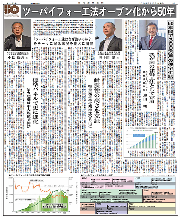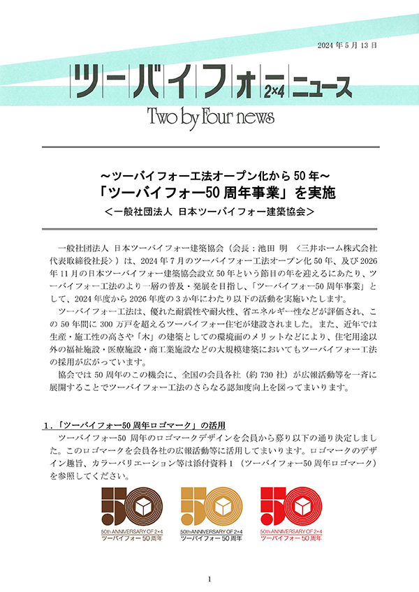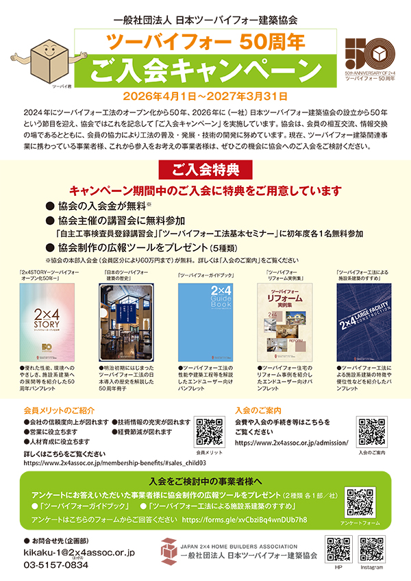 当協会は、2024年7月のツーバイフォー工法オープン化50年、及び2026年11月の日本ツーバイフォー建築協会設立50年という節目の年を迎えるにあたり、ツーバイフォー工法のより一層の普及・発展を目指し、「ツーバイフォー50周年事業」として、2024年度から2026年度の3か年にわたり活動を実施しています。