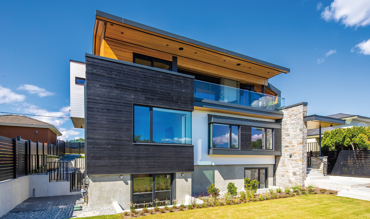北はバラード入り江とノースショア連山、南はバーナビー湖に挟まれた住宅地にあるこの住まいは、門前の桜並木に加え、遠くアメリカ・ワシントン州の海岸や山脈を望む南傾斜の敷地に3層で建てられました。