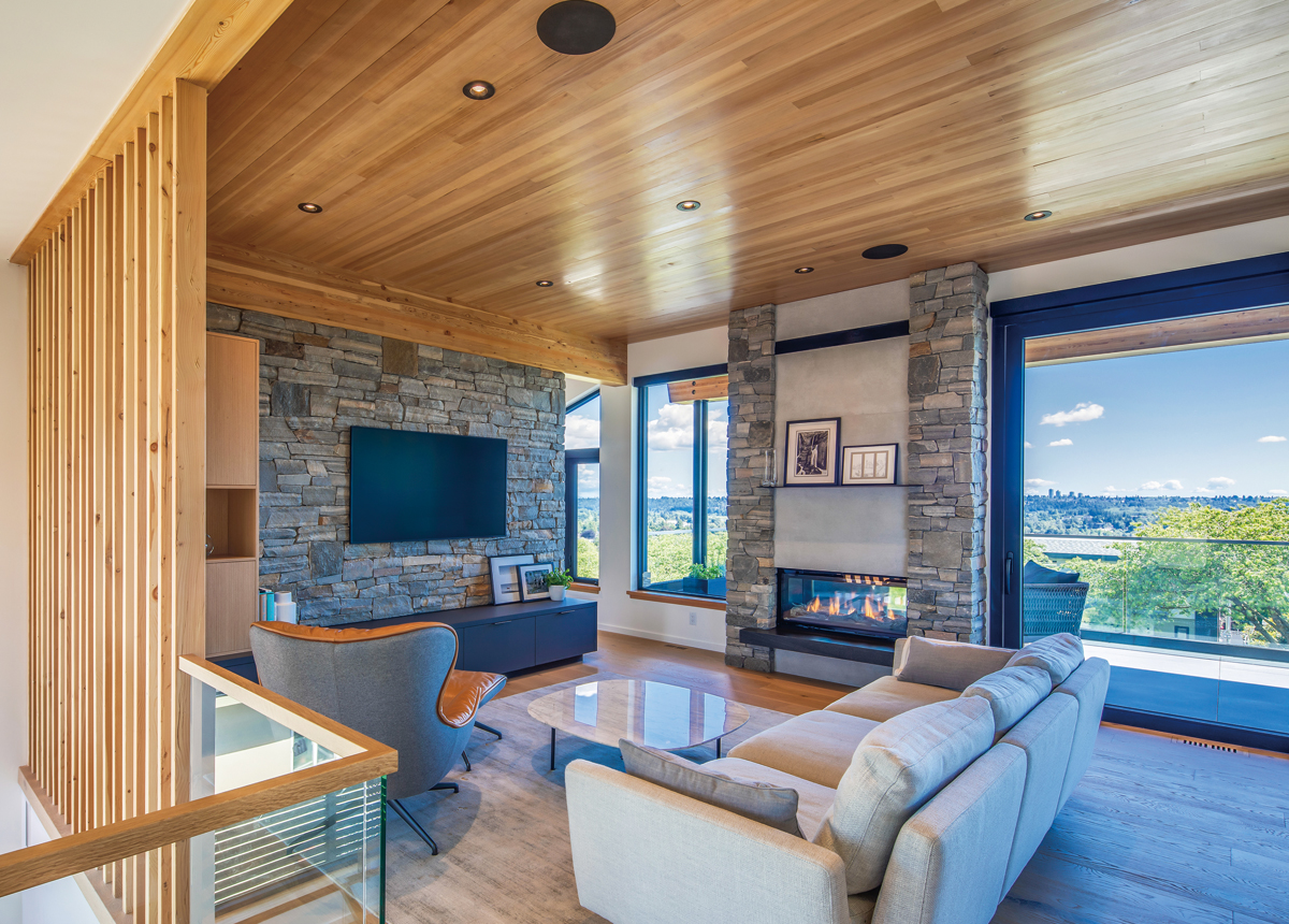 バーナビー湖の森を眺めながら暖炉で温まる最上階のリビングルーム。木製ルーバースクリーンのある北側からはノースショア連山を望む。天然石の壁やヨーロピアンオークのフローリングなど、自然素材の持つ力強い表情がインテリアに取り入れられている。
