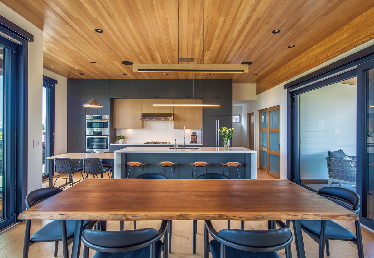 景色を楽しみたいというオーナーの希望をかなえるため、LDKは最上階に配置されました。外壁にツーバイシックス材を用い、天井と屋根にダグラスファーの集成材を用いて無柱の大空間と広い開口部を確保したことで、南北に視線が抜けるダイナミックな眺めが実現しました。リビングの南側に大きな半戸外のバルコニーを設け、二方向から眺められる暖炉を設置して、内外の空間の連続が効果的に演出されています。