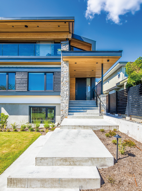 東端に配置されたエントランス。階段アプローチの屋根はベイツガのキャノピー。脇の石壁はエントランスの先にあるガレージや裏庭まで続く。