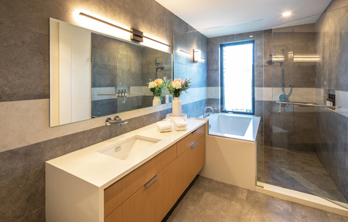 壁のタイルや照明器具の水平ラインがアクセントになっているバスルーム。浴槽からは日本風の坪庭が眺められる。