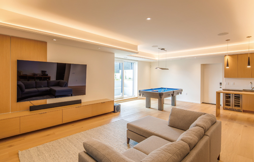 ドライエリアからの自然光と照明の明かりで包まれるような安心感のある半地下のセカンドリビング。