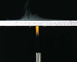 ツーバイフォーでは、すべての天井や壁の内側全面に、厚さ12.5mm以上の石こうボードが貼られます。石こうボードの中には約21%の結晶水が含まれていて、炎があたると熱分解を起こして約20分もの間、水蒸気を放出するという優れた特性を発揮します。このため火災が発生しても、天井裏や壁の内部の温度が上昇しにくく、構造材が発火点(約450℃)に達するまでの時間を大きく遅らせることができます。 また床・壁の内部に埋め込まれる断熱材も、火災時の熱が構造材に伝わりにくくし、石こうボードとともに木材の発火を遅らせます。これによりツーバイフォー住宅の耐火性は、さらに高くなっています。