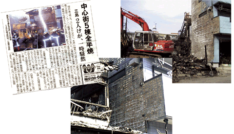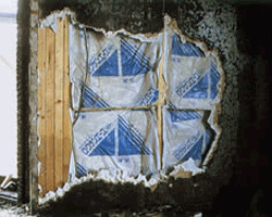 出火元住宅の解体後、姿を現したツーバイフォー住宅の西側の外壁。隣家との距離はわずか40cmであるにもかかわらず、表面の色がこげる程度の被害ですんでいる。(静岡県支部提供)