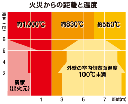 隣家で火災が発生した場合、外壁の表面温度は800℃以上にも達するといわれますが、ツーバイフォー住宅はもちまえの優れた耐火性で類焼を防ぎます。