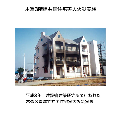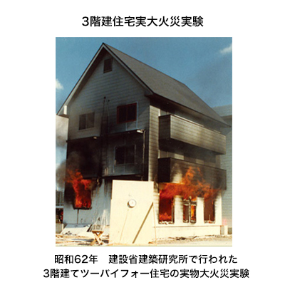 当協会では、ツーバイフォー住宅の耐火性向上のために、30年以上前から実大火災実験を重ね、技術や性能の検証とデータ収集に努めています。その研究成果に基づき基準改正の要望をまとめ、関係各機関に働きかけを行い、木造で初めて耐火建築の道を開きました。