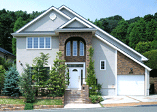 ▲重なり合うシャープなラインが印象的な大屋根、大きく吹き抜けたエントランスポーチ、重厚な質感のオールドブリックタイルをポイントにした外壁……外観は、豊かな緑を背景に堂々とした佇まい