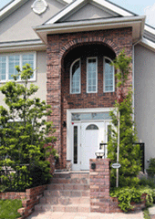 ▲真っ白な玄関ドアをオールドブリックタイルが取り巻くエントランスポーチは、ひときわ個性的