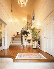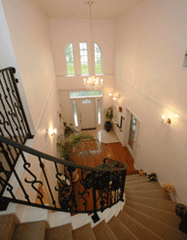 ▲弧を描くサーキュラー階段とロートアイアンの手すりが優雅な雰囲気を醸し出すエントランスホールは、訪れる人のため息を誘う