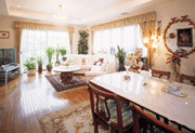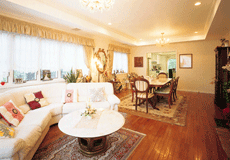 ▲LDKは約38畳の広く開放的な空間。天井のつくり、ムクのフローリング、木製サッシなど本物の輸入住宅ならではのしつらえに、アンティーク家具や照明器具が美しく調和。まるでアメリカの家庭にいるような感覚が味わえる