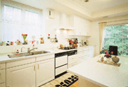 ▲白いシステムキッチンは奥さまお気に入りのドイツ製。アイランドはテーブル、収納、調理や盛り付けなど多彩に活躍