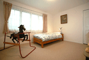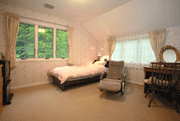 ▲書斎の上に設けられた奥さまの寝室。2面の連続窓の外は緑、緑…