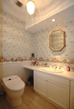 ▲ゲストも使う1階のトイレは、花柄のクロスや繊細なデザインの照明器具で華やかな表情に