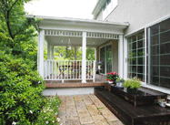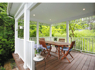 ▲隣接する緑地の自然を借景にしたポーチリビングは、快適なアウトドアスペース。時折、森の小鳥のさえずりも聞こえ、自然を身近に感じながらくつろぎのひとときを過ごせる