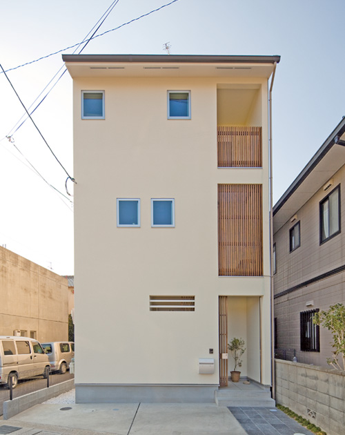 ▲外観はシンプルなボックスタイプ。アクセントとして設けた玄関ポーチと2、3階のサービスバルコニーの木格子は、防犯面にも役立つ
