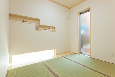 ▲和室は、壁面の季節の小物を飾るニッチとスリット窓がポイントの現代和風