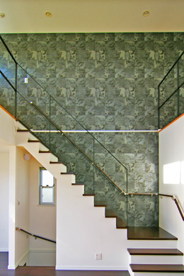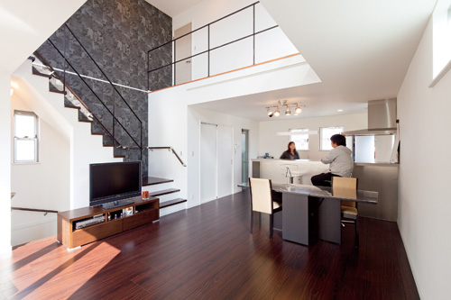 ご夫妻の一番のお気に入りは中央部が大きく吹き抜ける2階のLDK。その開放感あふれる空間もさることながら、階段側の壁に黒いクロスを貼ってアクセントにしたシンプル・リッチなデザインの提案は、インテリアにこだわりをもつ奥さまの心をとらえた。南側には広い屋上テラスが続き、室内に居ながら戸外の雰囲気を味わうことができ、快適性も抜群とのことである。
