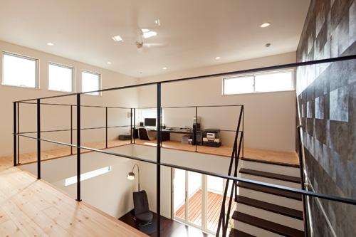 ▲3階回廊の一部はパソコン&オーディオコーナーに。シンプルなアイアン手すりが圧迫感のない開放的なイメージをつくり出している