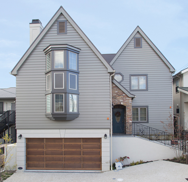 ▲傾斜地を活かして、半地下(地階)にビルトインガレージが配置されたスキップフロアによる5層構成の二世帯住宅。二連の切妻屋根と大きな出窓、煙突など洋館建築の外観デザインが取り入れられている。外壁にはブラウン系のサイディング、玄関ポーチにはアンティークレンガ、また木製のガレージドアが採用され、重厚感が演出されている。