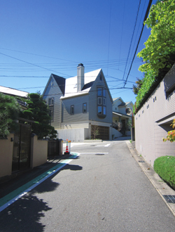 ▲坂の上に建つK邸。道路に面する北側と東側に、急勾配の切妻屋根の妻面を見せる洋館建築のデザインが印象的な佇まいを見せる。