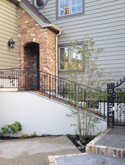 ▲傾斜のある角地という敷地条件を活かして、緩やかな階段アプローチがL型につくられている。門扉と手すりはポーチのアンティークレンガに調和するデザインになっている。