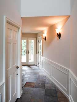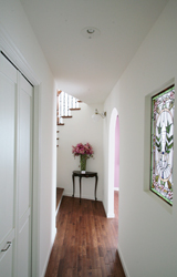 ▲エントランスからテラスまで伸びる1.6m幅のコリドール。腰パネルとドアが同じデザインになっている。右奥はお母様の玄関ドア。左手前のドアを開けるとガレージへの階段がある。