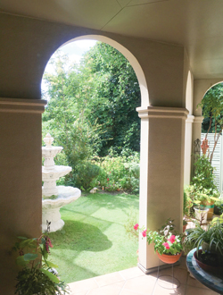 ▲南側にあるテラスと庭。コリドールの先にあり、お母様のリビング・ダイニングや奥様の趣味室からも出入りできる。
