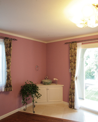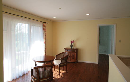 スキップフロアの立体的な空間デザインとともに、インテリアデザインにも配慮され、生活空間であるLDKの基調色を、すべての色を包括する白にする一方、趣味室はローズピンク、応接室はモスグリーンがテーマカラーになっています。こうしたカラーリングやモールディングなど西欧の伝統的な意匠デザインは、洋風建築の歴史を積み重ねてきたツーバイフォー住宅ゆえにしっくりと溶け込みました。