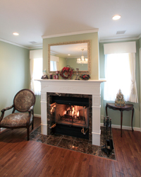 ▲暖炉が設置された中2階の応接室。モスグリーンのカラーコーディネートにより、クラシックな雰囲気が醸し出されている。