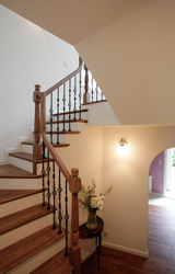 ▲中2階から2階への階段。手前に応接室があり、正面の1階のアーチをくぐると奥様の趣味室がある。