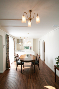 ▲お母様の住居のリビング・ダイニング。左手の掃き出し窓からテラス・庭に出ることができる。右手に見える対面式キッチンは、壁面と同じクリーム色でコーディネートされている。白いモールディングが施された開口の向こうはグリーンを基調にした寝室。