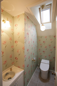 ▲階段下を活用した1階のトイレ。主寝室同様、ご夫妻の好みの色合いに。