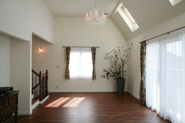 ▲勾配天井にトップライトが設置されたリビング。ツーバイフォー工法の遮音性は、気兼ねなく音楽を楽しみたいというご主人の希望と合致した。