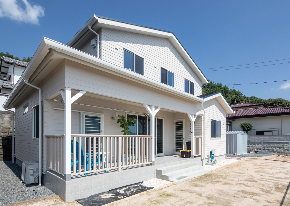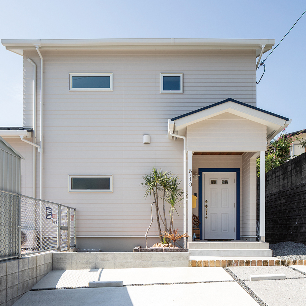 瀬戸内海を見下ろす高台に建つ白い家は、Eさん夫妻の温めていたイメージがかたちになったカリフォルニアスタイルの住まいです。切妻屋根の破風、ラップ調サイディング、屋根・フェンスの付いたテラス、窓サッシも白色。一方、室内には白を基調としながら、木のナチュラルな風合いを楽しめる無垢材を多用。外・内観ともに明るくさわやかなリゾートの趣です。