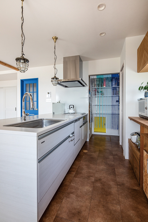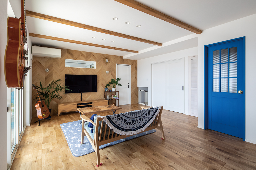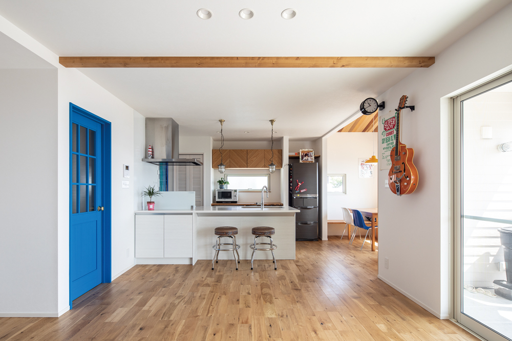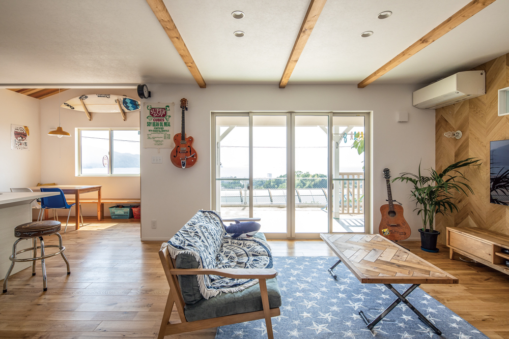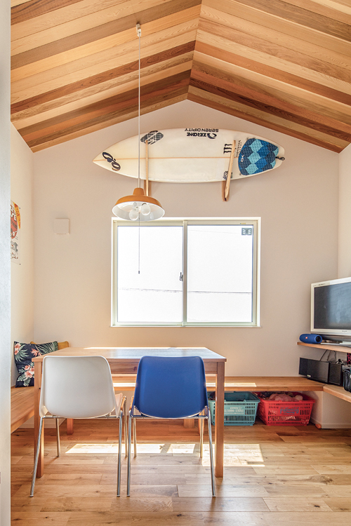 内装は夫妻の希望で、床にはオーク無垢材、壁面と吊り戸の一部にはヘリンボーンの無垢パネル、玄関とダイニングの勾配天井にはレッドシダーが張られ、温もりのある空間に。色調や装飾にもこだわられ、ブルーの室内ドアや家具、照明器具などマリンテイストで演出。また、サーフボードやギターが壁に掛けられ、好きな物に囲まれて暮らすライフスタイルを楽しまれています。カリフォルニアスタイルの住まいを通り抜ける海風は、暮らしに新たなシーンも創出。「子供たちとサーフィンができる日が楽しみです」と、夫妻は計画を話してくださいました。