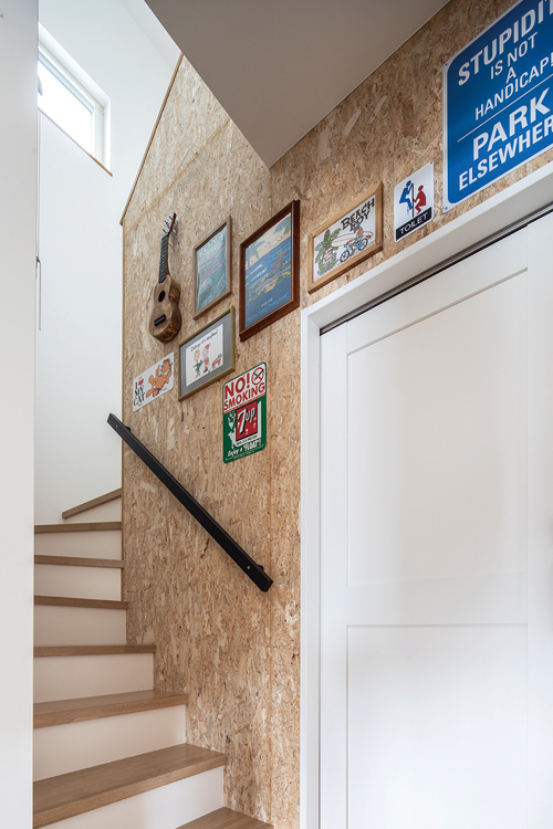 ▲階段のOSBボードの壁はデコレーションのスペースとして使用。階段下には愛犬のためのコーナーがある。