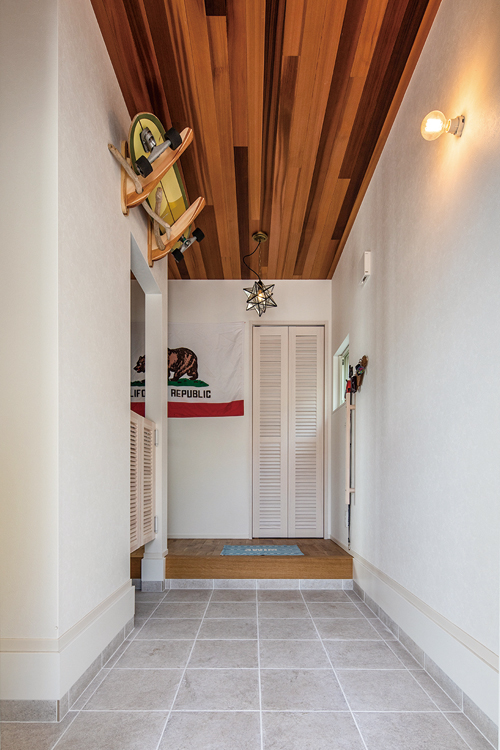 ▲天井にレッドシダーが張られた玄関。サーフボードが掛けられた下のスイングドアの奥はクロークになっている。