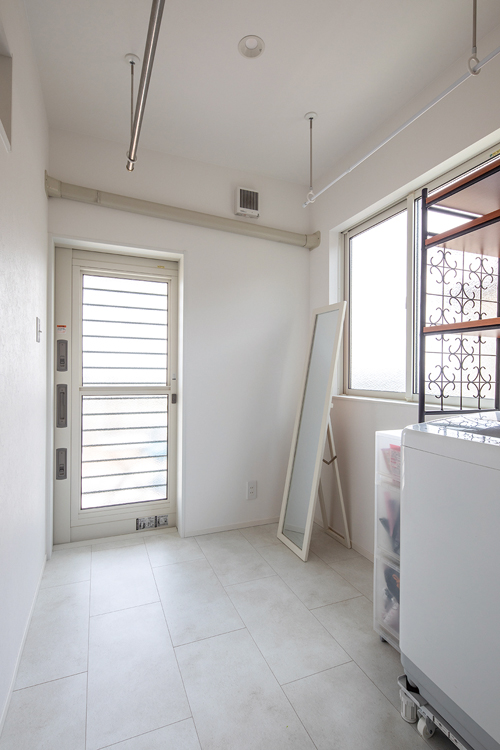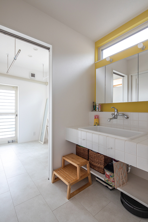 ▲イエローの壁が明るくさわやかな印象を与える洗面室。奥のランドリールームからテラスへ出られる。手前には浴室が隣接するので、海から帰ってきたとき、玄関や居室を通らずシャワーへ直行することができる。