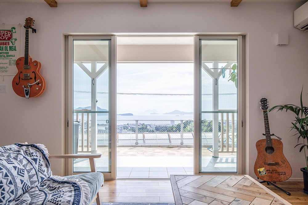 ツーバイフォー工法によるE邸は高い断熱・気密性も実現。「海の眺めを楽しみ、家族を見守れるようにとオープンなLDKをつくりました。夏は風が通り涼しいのはもちろん、冬がとても暖かい。1年中快適なのでいつも家族が自然と集まってきます」と奥様は微笑まれます。