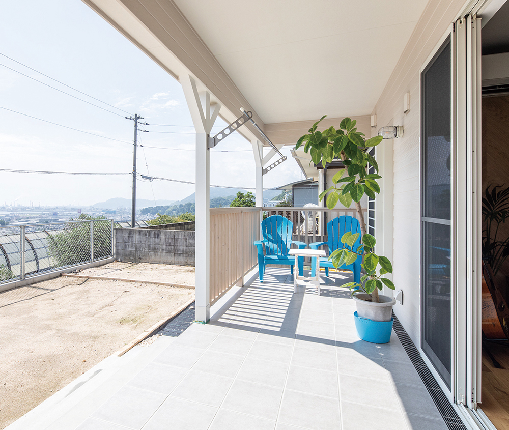 ▲瀬戸内海が眺められる南側に設けられた広いカバードテラス。屋根に覆われ、Y型の柱や格子のフェンスが設置されていることが特徴。リビングから段差なく続くので、部屋の延長空間として使うことができる。